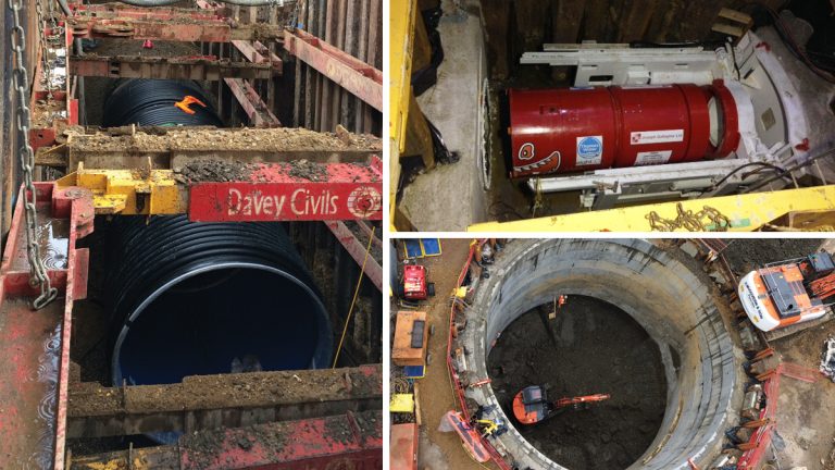 (left) DN2400 Ridgistorm XL pipeline excavation, (top right) tunnelling machine ready to go at Battersea and (bottom right) main PS shaft constructed using under pinning – Courtesy of eight2O