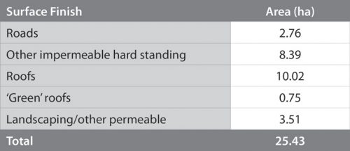 The breakdown of the area and finishes draining into the new surface water sewer system are shown in the table (below) and includes the 13ha removed from the existing combined network:
