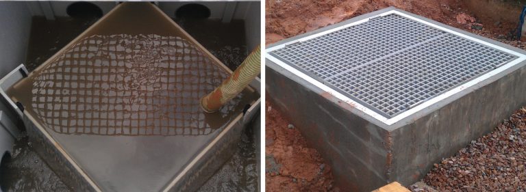 (Left) Flow splitter chamber internal and (right) Prefabricated GRP flow splitter chamber with concrete surround – Courtesy of SWW Delivery Alliance H5O