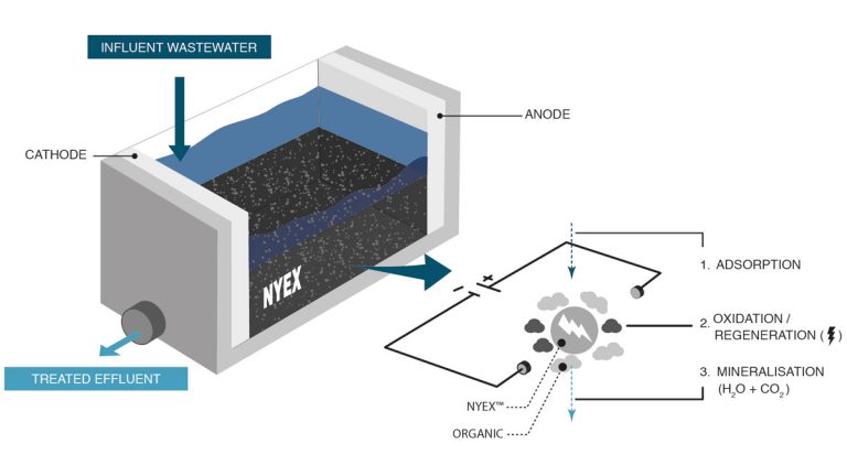 Contaminated water is top fed in the Nyex treatment system and percolates through the bed of adsorbent with in situ simultaneous adsorption and electrochemical oxidation. Adsorbed organics are oxidised and the surface of the media is regenerated for further adsorption without interruption or replacement. The clean treated water flows from the bottom of the system for use.