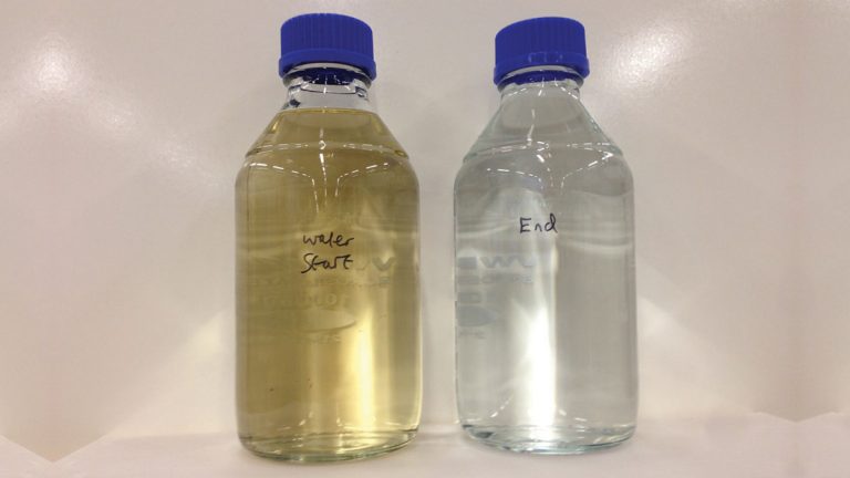 The technology is being applied in combination with an ion exchange system and the total solution is targeting both hydrophobic and hydrophilic organic components. Peaty water naturally contains humic compounds along with fulvic acid which causes colour. Nyex preferentially removes the hydrophobic components, which stick to the system’s adsorptive media.