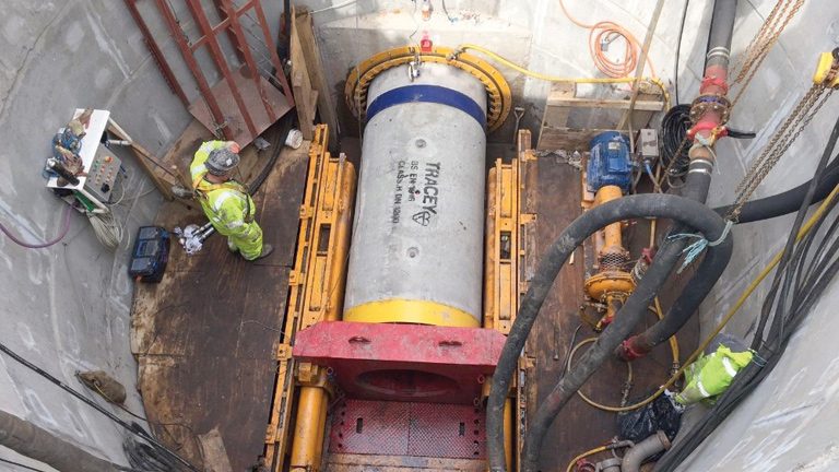 The pipe-jacking operation balanced groundwater and earth pressures, and once the MTBM had removed the soil, individual sections of concrete pipe were installed sequentially and jacked into position to the rear of the machine. This method is be much more efficient and less disruptive than using the open cut method of excavating, given the depths of the pipe and the urban location.