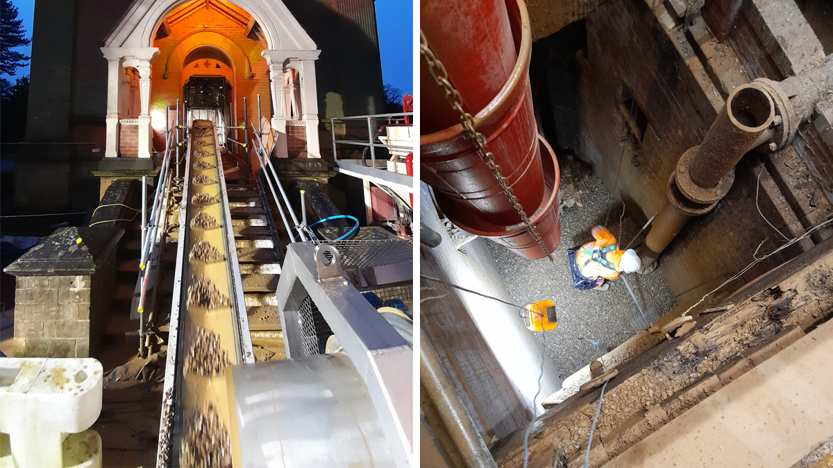 (left) Conveyor system into historic pump house and (right) levelling of gravel within shaft – Courtesy of Galliford Try