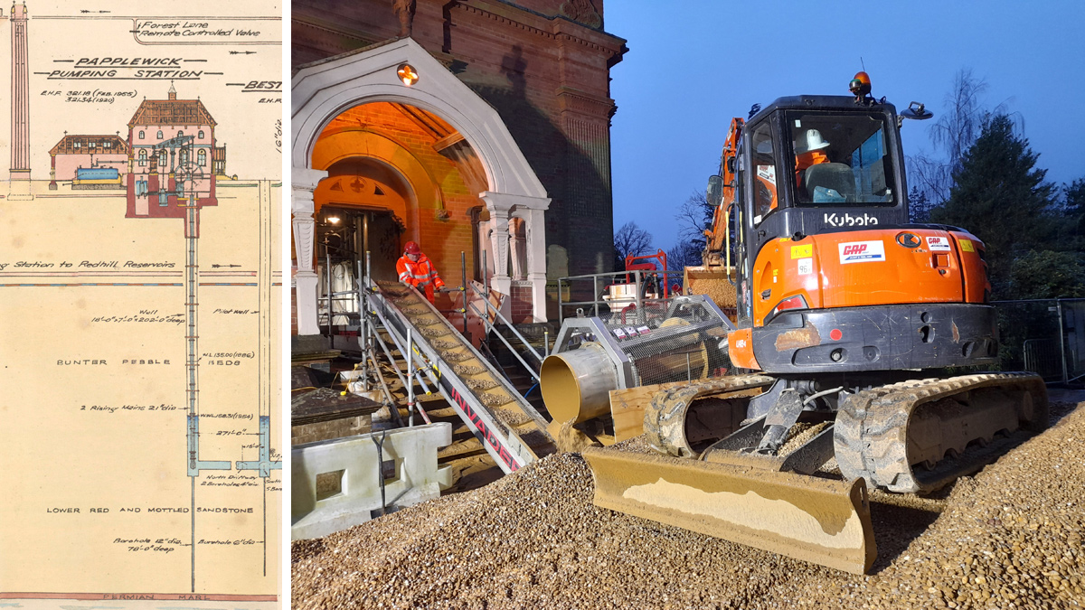 (left) Original drawing showing link between on-site wells and (right) gravel installation using a trommel – Courtesy of Galliford Try