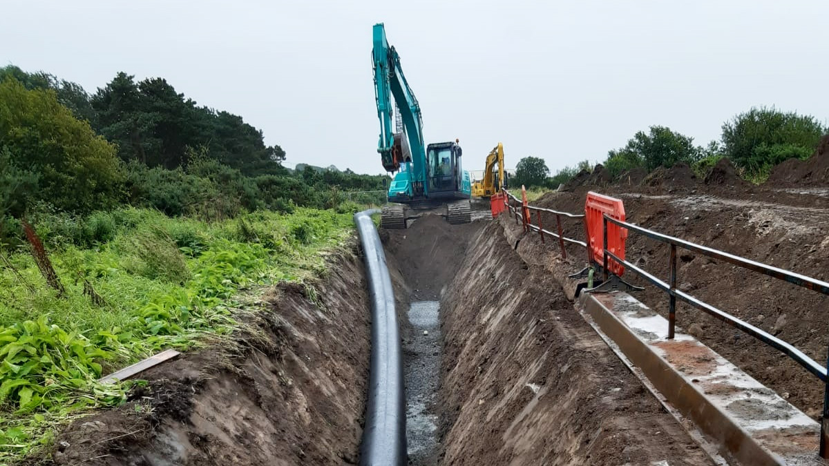As the replacement of the old ductile main affected two distinct areas, both sections of the new pumping main could be undertaken in tandem to meet the demands of the programme. Condition surveys and ecological assessments were undertaken before pipelaying work got underway in the West Winds Estate in May 2019. 580m of pipe was laid by traditional open-dig methods before the land was reinstated and landscaped in November 2019.