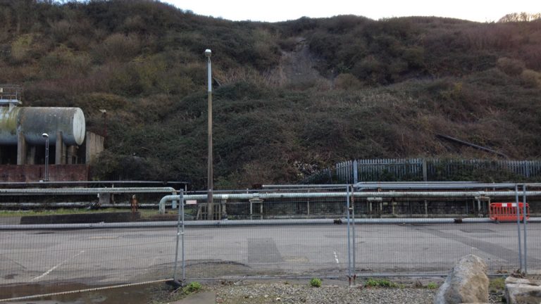 The line of the bypass sewer came out into the haulage road in one area in order to maintain a buffer zone between the land slip and the sewer and supports in case further land slips occurred. More recently, towards the end of 2015 Wessex Water realigned this section of sewer as the Port Authority had plans to widen the haulage road.