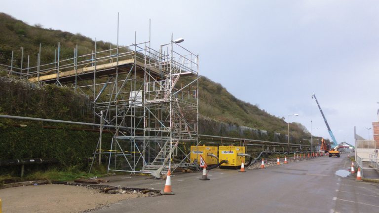 During extreme weather conditions experienced across the UK in 2014, coastal areas saw conditions that would cause major flooding for residents and major concerns for all utility companies that had infrastructure within the affected areas. Portland being one of the most exposed coastal locations in the South suffered more than other areas. At the height of the storm Portland experienced 20ft high waves and prolonged heavy rain which caused landslides, flooding and moved several thousands of tons of stones on Chesil Beach. Wessex Water was contacted by Portland Port Authority and informed that an above ground 700mm diameter gravity sewer had been completely displaced by a large landslide within the Port. Wessex Engineering and Construction Services visited the site the following day to look at options for repairing the sewer.