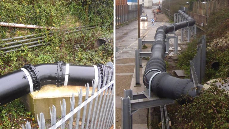 (left) Extent of bypass pipework showing downstream connection point and (right) Raised bypass sewer on galvanized supports - Courtesy of Wessex Water