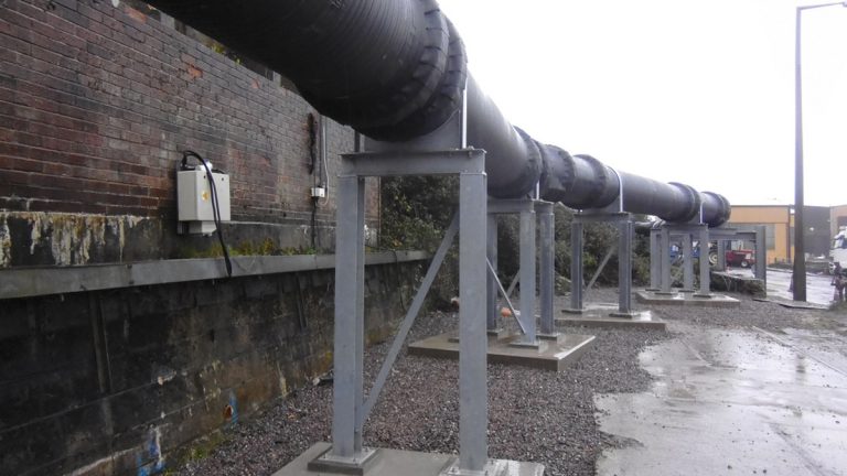 The pipework was supported along its length by galvanized support legs with either two support legs or four depending on their positioning. Flows within the pipe can exceed 500l/s so the design had to allow for acting forces and ground conditions.