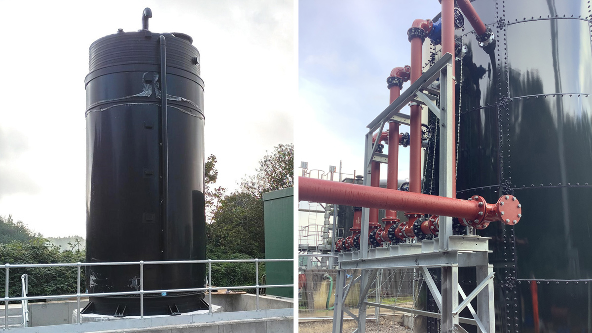 (left) Worsley WwTW caustic dosing and (right) sludge storage tank from Stortec Engineering Ltd at Worsley – Courtesy of Advance-plus