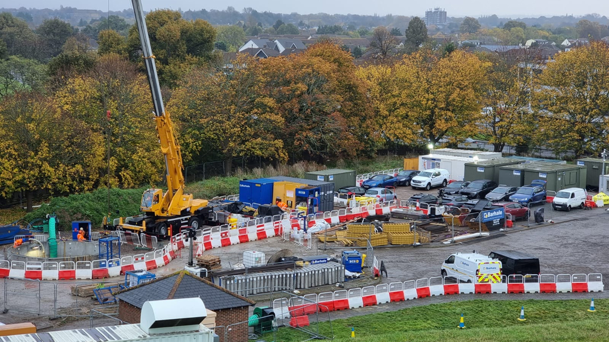 The temporary shaft required for the inlet tunnel was located at the base of the QEII Reservoir embankment. This access shaft was between the reservoir embankment and Walton Road, which runs parallel to the northern side of the reservoir and is a well-used route between residential areas. To gain access safely and at the correct location over the tunnel, it was necessary for the shaft to encroach on the road. Initially it was essential that the road was closed, but as soon as it was safe to do so, one side of the road was reopened to minimise disruption to the travelling public.
