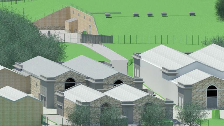 The clarifier building will be located on land adjacent and to the west of the existing works. The 80m x 40m x 14m structure will be buried on 3½ sides to disguise its presence. Ventilation pipes emerging at the surface will be disguised as beehives and careful planting of trees will further blend the site in with the surroundings.