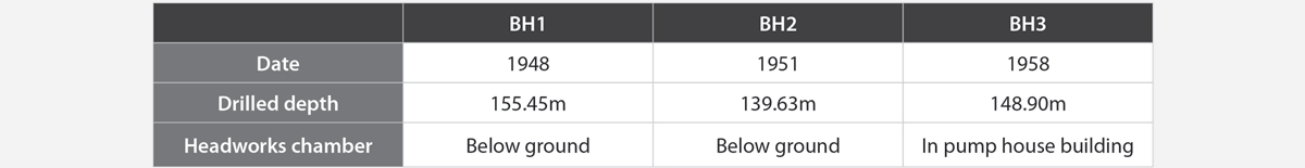 In 2014, Severn Trent graded the existing casing as very poor in BH1 and BH3, and poor in BH2. The boreholes are also nearing the end of the generic asset life for Permo-Triassic sandstone boreholes. Additionally, the unlined section of BH3 is enlarged and potentially unstable as a result of the use of explosive charges shortly after construction, in an attempt to improve yield. The table below details the original borehole construction: