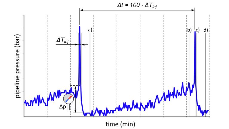 Schematic pressure curve at the injection point of the sludge pipeline. When a pre-defined pressure level is reached, compressed air is injected for a few seconds, after which the pressure in the sludge pipeline drops. The PC pump is then used over a period of several minutes to pump a new sludge plug into place, whereupon another compressed air injection takes place.