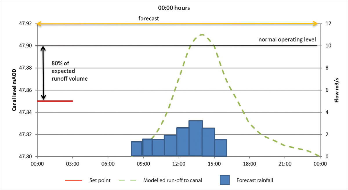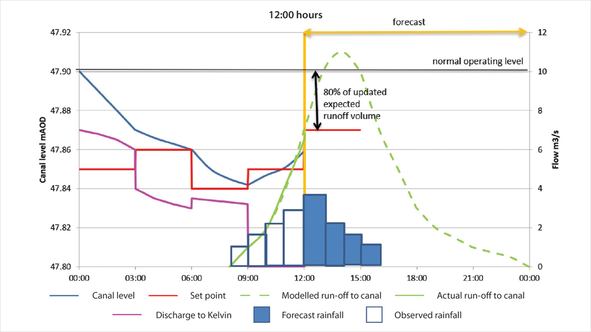 The control philosophy has to balance several conflicting factors such as minimising water wastage, maintaining navigation by canal traffic, and the consideration of forecast accuracy. Accuracy decreases as the forecast period increases, however drawdown of the canal takes a long time – approximately 18-hours to drawdown 100mm if all discharge sluices are fully open. If the canal is drawn down too far in advance, there is a risk that the predicted inflow to the canal will be inaccurate and either too much or too little storage provided. Delaying drawdown risks not reaching the required level in time. Both could lead to insufficient flood mitigation or significant water wastage.