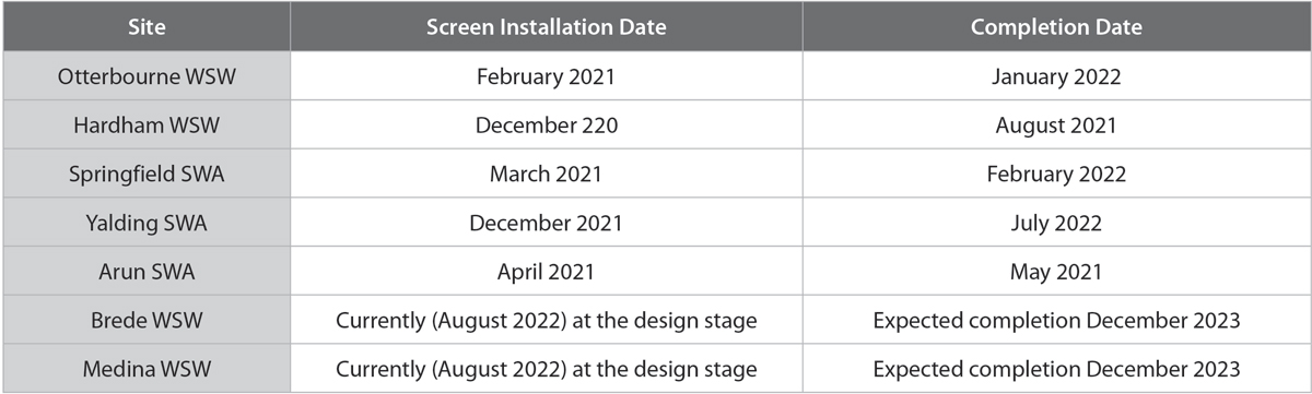 In total, seven abstraction sites within the Southern Water region are included as part of this programme of works; all of which must meet stringent regulatory dates. At the time of writing (August 2022) five have been completed, and two are at the outline design stage. The table below shows key dates for each project: