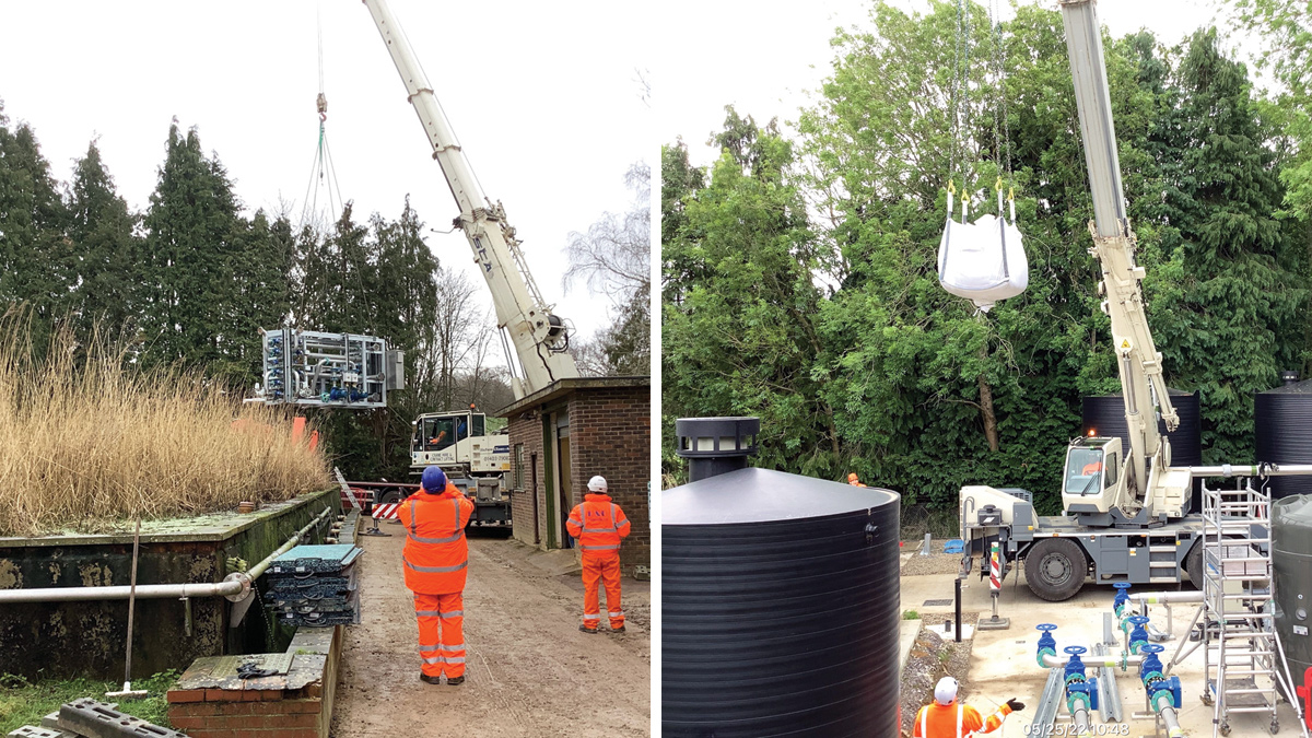 (L) Lifting of tertiary treatment plant, control panel and pipework manifold and (R) loading of media into TTP pressure vessels – Courtesy of CMDP JV