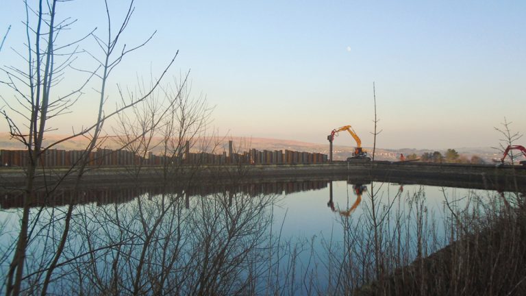 Installation of the crest sheet-pile cut off wall using a Movax vibrating hammer at Springs IR. Dingle IR is visible at the embankment toe - Courtesy of MMB