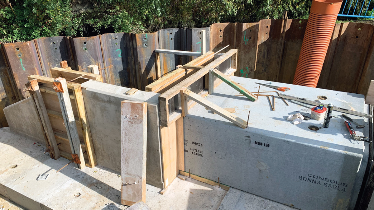 Poor ground and underfoot conditions adjacent to the River Rother proved too risky and problematic for traditional mobile crane lifts, so all lifts of the precast sections were to be undertaken with a tracked excavator. This further constrained the design and restricted the maximum mass of each section to 13 tonnes. Consequently, in its final iteration the precast headwall was designed in two sections and was combined with an in situ toe and infill slab/wall which completed the structural design.