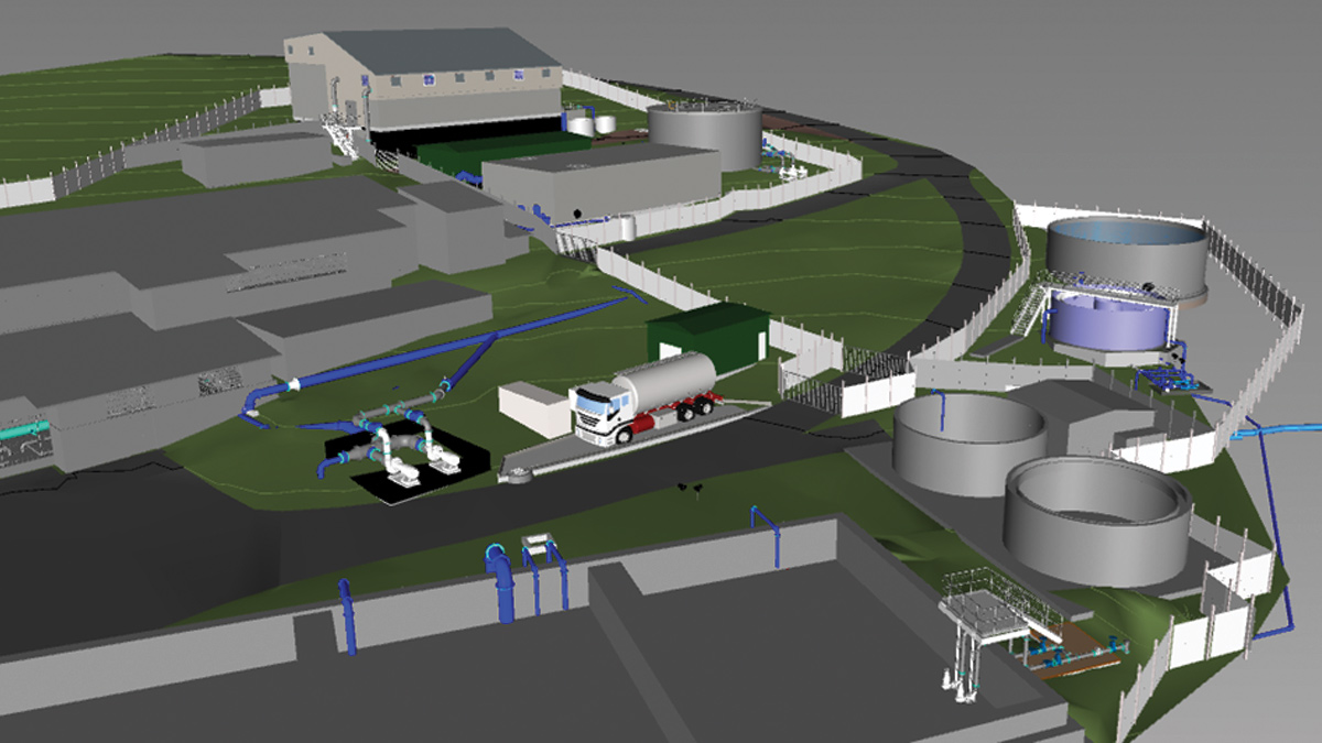 Model extract showing the existing works on the left, the new process plant on the right, and the GAC at the top of the slope – Courtesy of Galliford Try