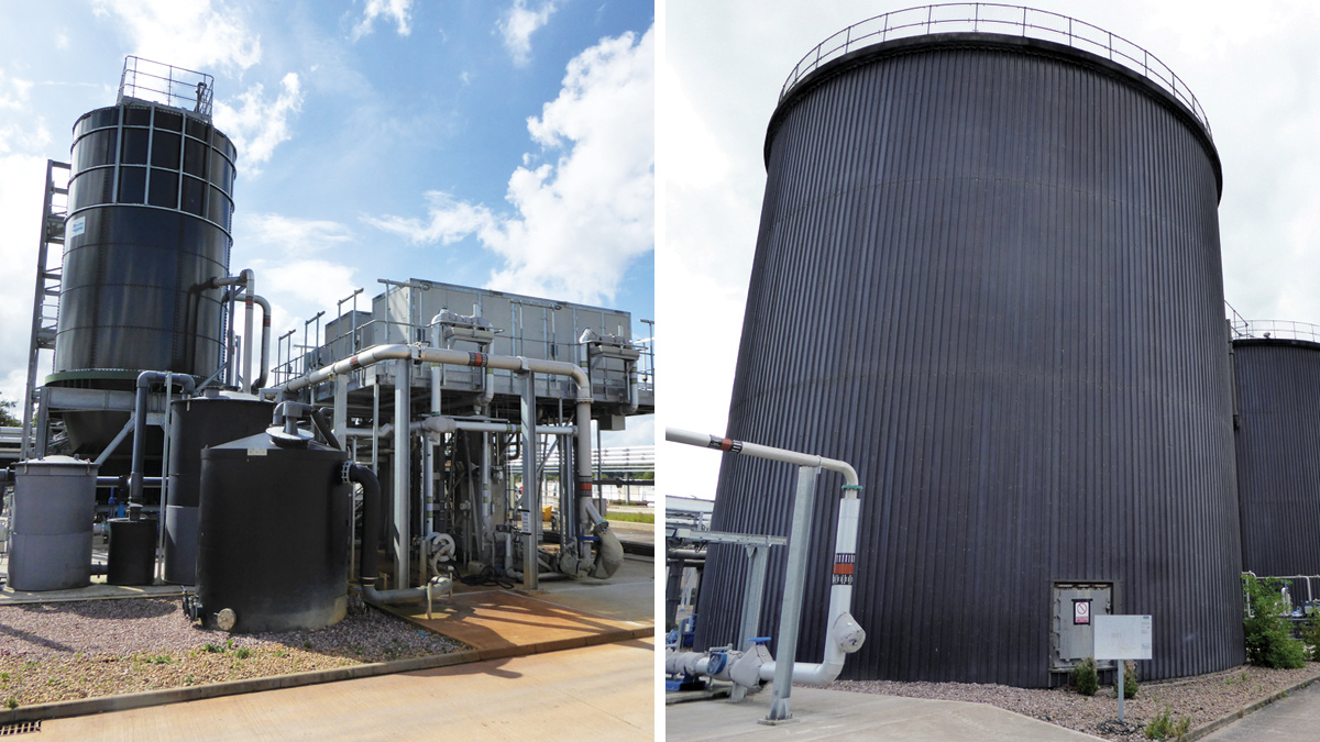 (left) Centrifuges and sludge cake silos and (right) digester bank – Courtesy of Severn Trent