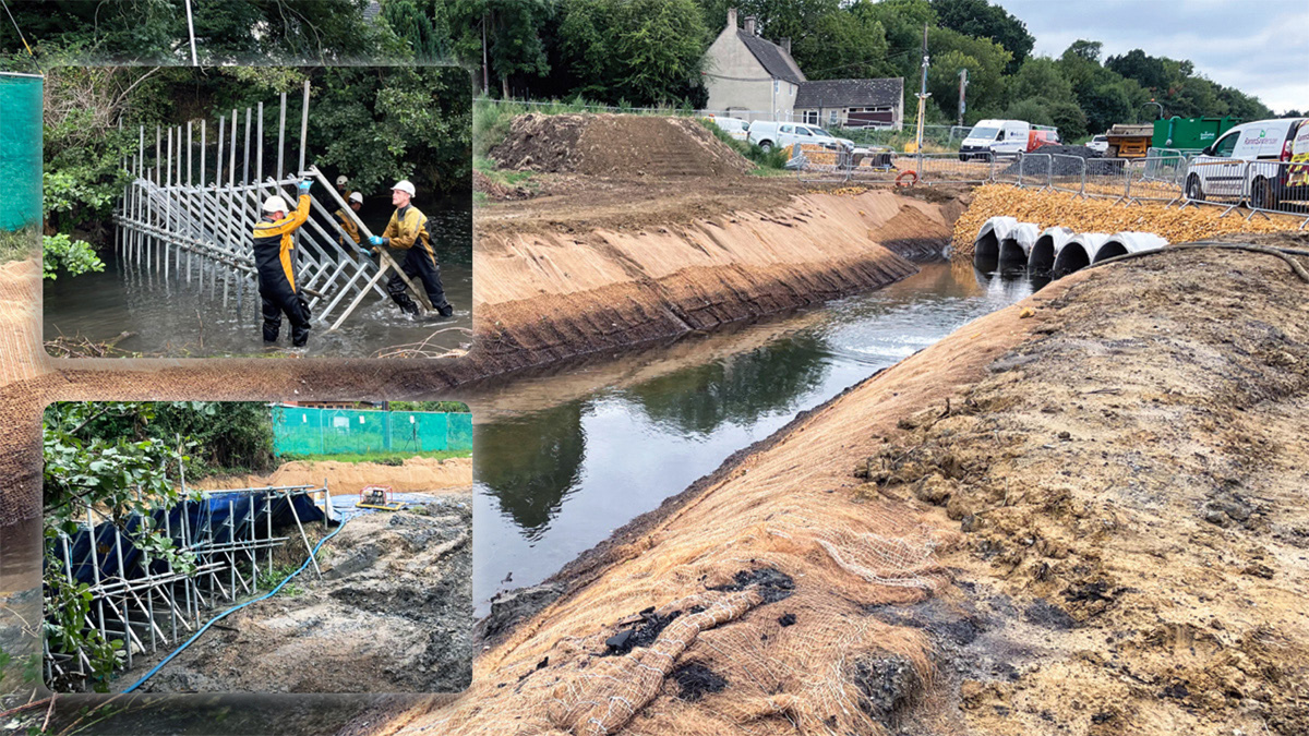 Construction of bypass channel and (inset) installation of the temporay PortaDam from OnSite Central Ltd – Courtesy of Galliford Try