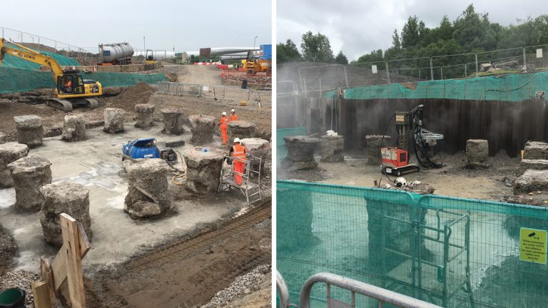 (left) Tops of piles excavated to foundation base formation level and (right) hydro demolition of tops of piles – Courtesy of Skanska Construction UK Ltd