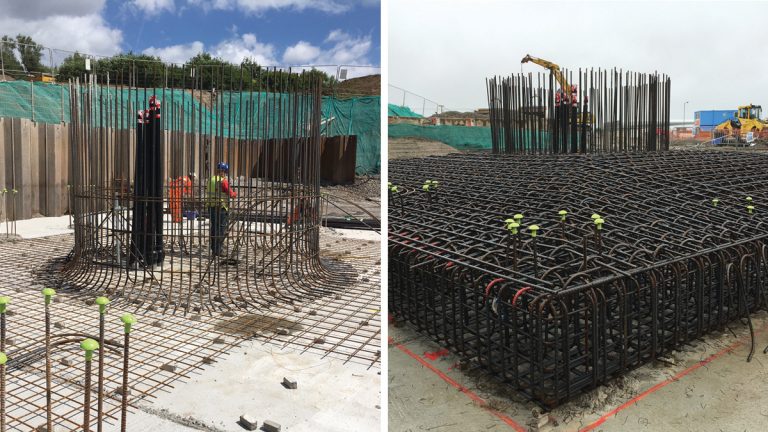 (left) Fixing of foundation steel reinforcement bars and (right) foundation base steel reinforcement – Courtesy of Skanska Construction UK Ltd
