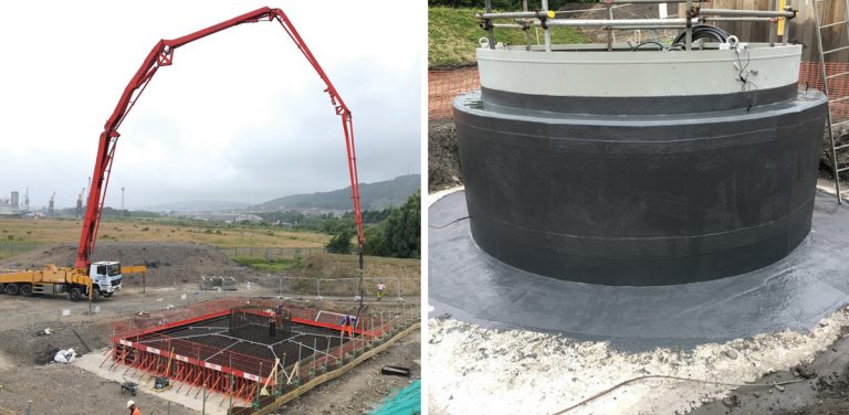 (left) Foundation base concrete pour and (right) foundation plinth and tower anchor with waterproofing applied – Courtesy of Skanska Construction UK Ltd