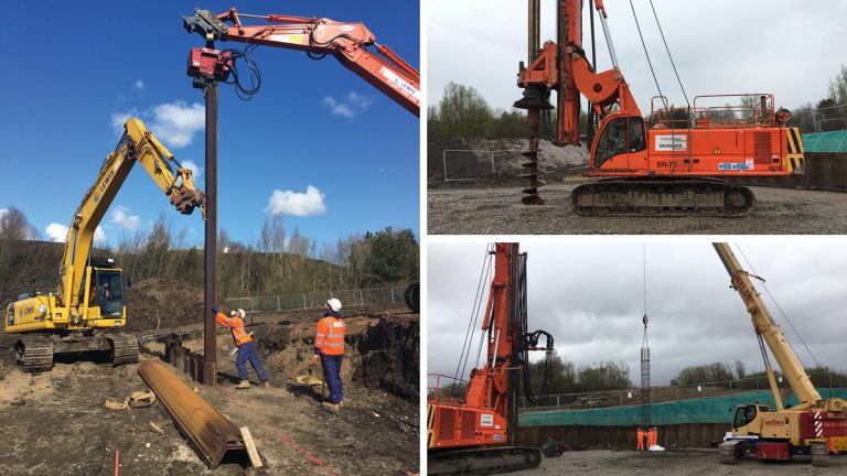 (left) Installing sheet piles for slope stability and protection of rising mains, (top right) Rotary piling rig and (bottom right) Installation of pile reinforcement cage – Courtesy of Skanska Construction UK