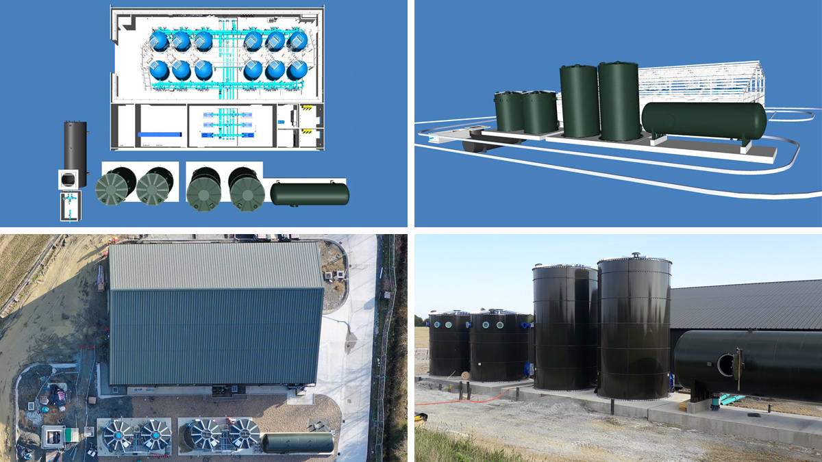 4D model and as built (left) the plan view and (right) from left to right the two aeration tanks, the primary and secondary filter backwash tanks, and the chlorine reaction vessel – Courtesy of Essex & Suffolk Water