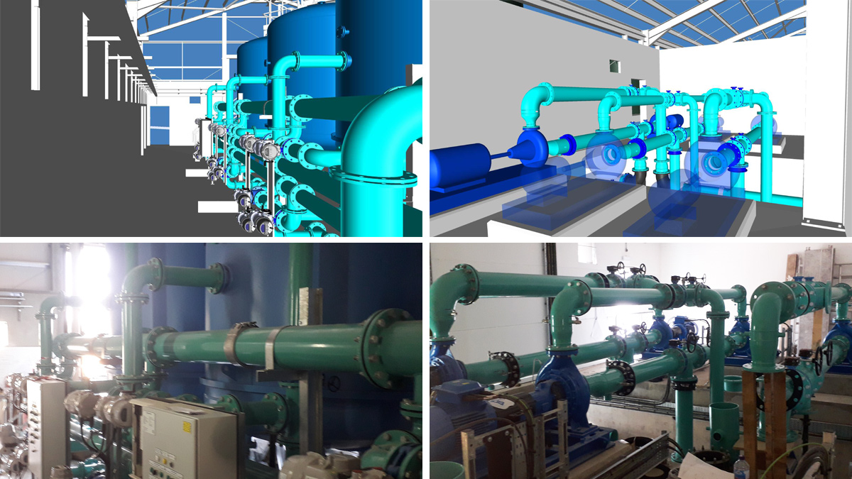 4D models and as built (left) primary filters and pipework and (right) the plant room with six VSD pumps and two positive displacement air blowers – Courtesy of Essex & Suffolk Water