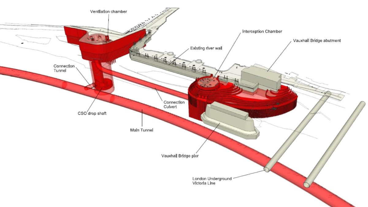 - The interception chamber which combines flows from the Clapham and Brixton storm relief CSOs and accommodates a new CSO outfall.