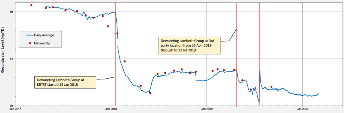 Ground gas has previously been noted in the London area in papers by Newman in 2013 and on other prominent construction sites. It is thought to be caused by historical abstraction from the Lower Chalk and Thanet Sand aquifer creating a cone of depression within the London area which allowed the Chalk to become unconfined and thus air entered the overlying strata which overtime became trapped and pressurised as abstraction reduced and the water levels recovered. The gas encountered in the surface wells were tested and confirmed to be completely depleted of oxygen. Thus, if this was encountered in a tunnel setting it would create a hypoxic atmosphere which would be a significant health and safety risk to the workforce.