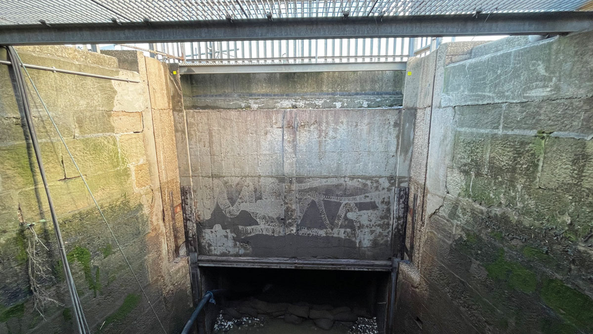 Once all the temporary flow control measures had been installed, construction commenced with the removal of the existing flooring, support beams and guillotine gate from the sluice chamber. The new concrete wall was cast off site, delivered by road and the fixing frame for the penstock bolted into position prior to the lift into the chamber. The new concrete wall utilised the existing guillotine gate rebates in the sluice chamber wall, these provided anchorage to the structure and were strengthened with cast in situ concrete wing walls. Repairs were also undertaken to the sluice chamber walls and concrete base as part of the scope to increase the chamber’s asset life. Following installation and commissioning of the penstock and actuator, a new GRP floor to the chamber was provided and the chamber reinstated to normal operating condition.