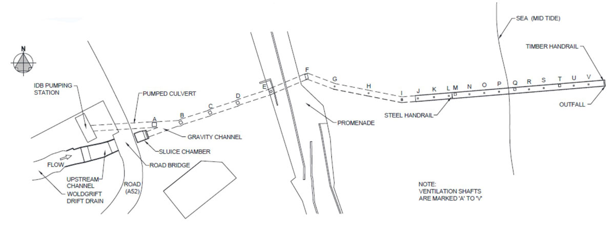 The Woldgrift Drain is an open channel that diverges upstream of the A52 Sutton Road and IDB Pumping Station. The discharging flows pass through a coarse debris screen, under the road and into a sluice chamber with a tidal flap valve on the upstream entrance. On high tidal conditions this flap valve will close and retain flows upstream and subsequently divert flows to the IDB pumping station well. On the downstream exit of the sluice chamber was a wooden guillotine gate which had historically been used for flushing the downstream culvert. The flows continue offshore through a rectangular culvert under the flood protection and beach to a discharge location close to low water. Along the length of the culvert there are a number of access chambers and ventilation shafts. It is understood that one of these chambers, Chamber F located on the beach at high water, used to contain a tidal flap valve but this was no longer operable due to corrosion some years ago.