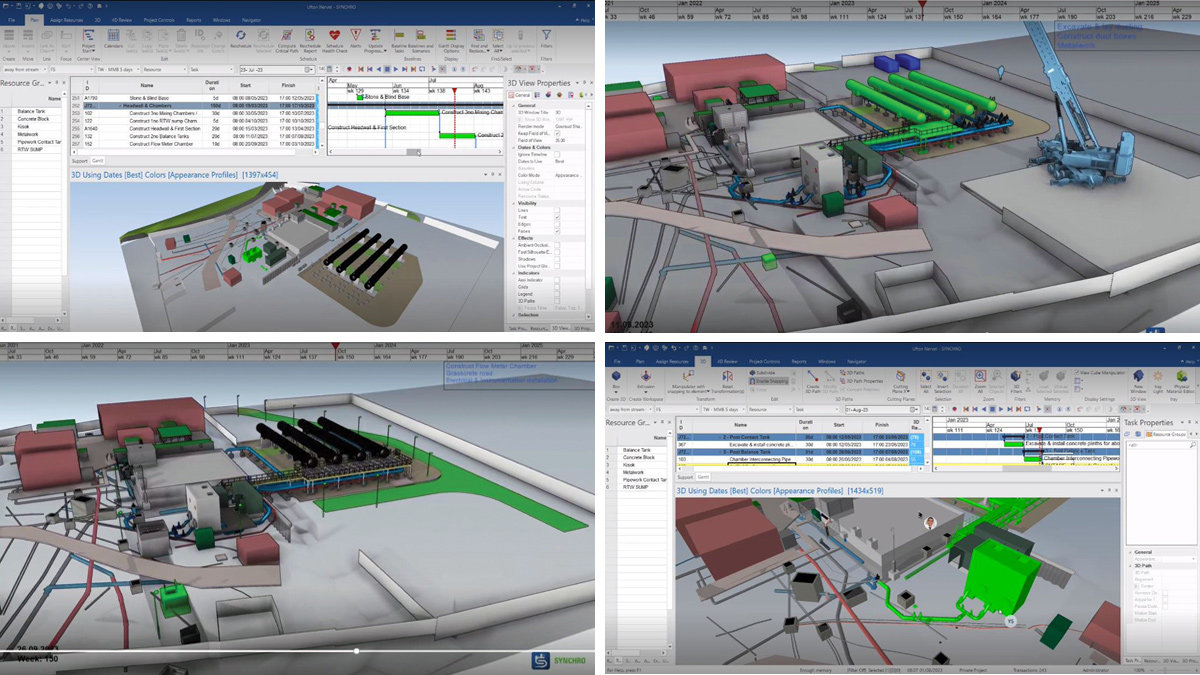 By combining the P6 programme with the 3D model and reviewing it via SYNCHRO software allowed a better understanding of the concurrent activities and the ability to spot where there could have been potential space constraints. The digital rehearsal revealed that the design was proposing to install precast pipe support plinths and the access metalwork at the same time as the contact tanks were being installed, so SYNCHRO was used to update the P6 programme live to re-sequence the work.