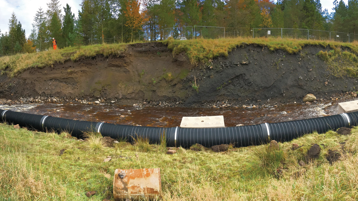 Working with the designers, JBA, the methodology was changed to install the pipe using an 80t crawler crane, temporarily supporting and also strapping down the pipe whilst placing concrete surround to the pipe. Once the pipe was surrounded an access ramp could be formed into the void. Approximately 6,000m3 of the surrounding spoil slopes were benched and re-profiled over the new installed culvert.
