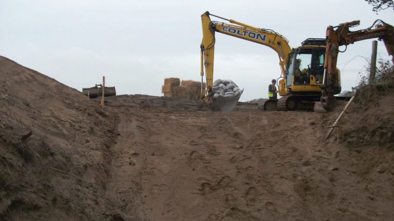 - Himalayan balsam: Evident on the river bank and required monitoring during all works on the bank. Foliage was stripped from the bank and retained close by to avoid any cross-contamination. The same procedure was implemented for the reinstatement of topsoil once the headwall was completed. Plant and machinery was cleaned before tracking on the field after working on the bank, and operatives’ footwear was also cleaned on exiting the bank.