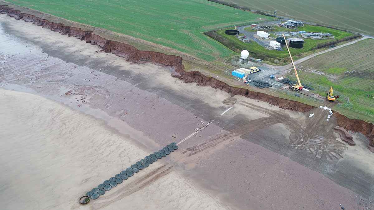 Aerial view of the temporary emergency protection works for existing LSO with the original Withernsea WwTW on the eroded clifftop – Courtesy of Royal HaskoningDHV