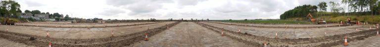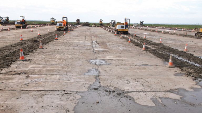 All plant was required to work in designated lanes and remove existing overburden prior to tracking to the next slab. This efficient procedure was ideal for the use of multiple plant items, with 10 excavators and 10 tracked dumpers to remove the topsoil.