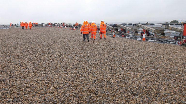 During reinstatement, to minimise unnecessary damage to the new membrane, MMB employed a system of conveyors teamed with an army of operatives and a fleet of 56 (No.) wheelbarrows to place 14,000 tonnes of clean, rounded gravel.
