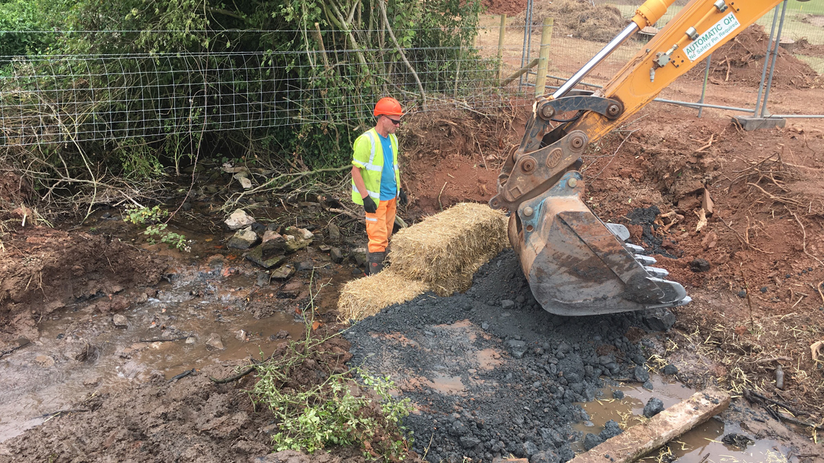 A 225mm diameter vitrified clay sewer ran under the embankment which was replaced with integrally socketed PVCu structured wall type and sealed manhole covers to prevent it from becoming a bypass route under the embankment during filling. A field drain was also blocked off and diverted to flow into the existing watercourse.