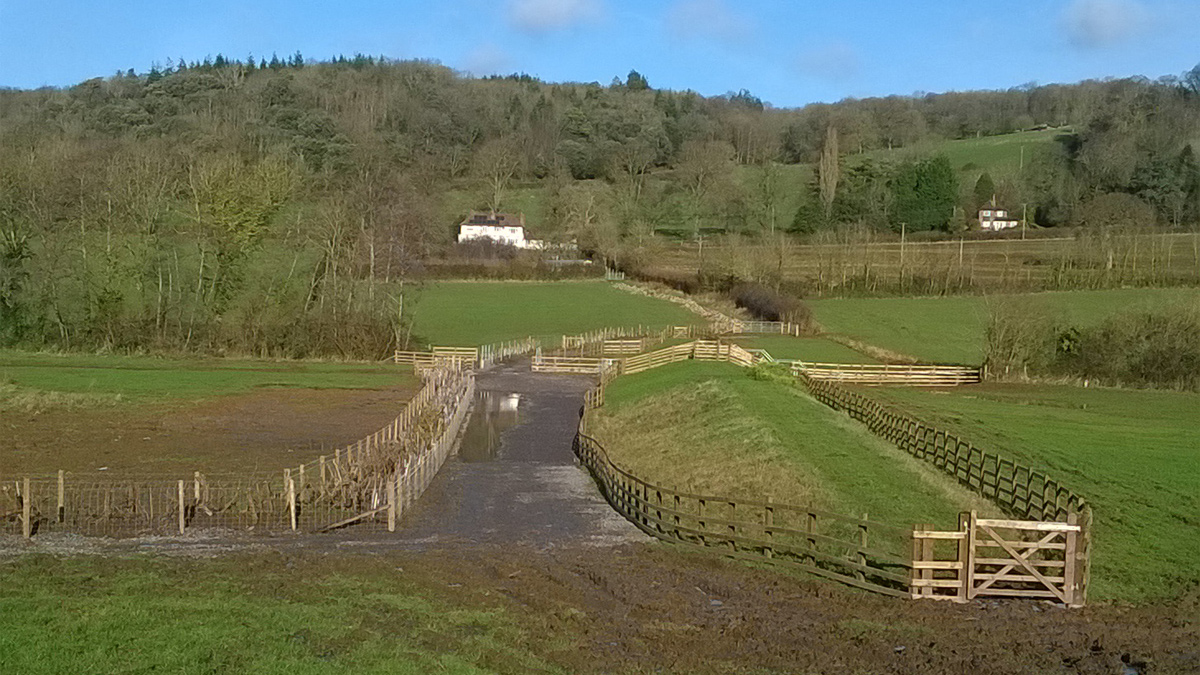 The embankment is located to allow continued farmer’s access to his fields during flood events and accommodates a footpath over the dam which currently runs alongside the brook. Steps had to be constructed to allow hikers to walk over both faces of the embankment with fencing and gates to prevent them freely roaming over structure. Fencing was also erected at the toe of the dam to prevent cattle from accessing the faces of the embankment since the pressure exerted by cattle through their hooves is enough to cause soil erosion and, in time, the crest level to degrade. Although sheep are acceptable and can help crop the grass which allows for good inspection, the farmer is a cattle farmer and hence the need for the extra protection.