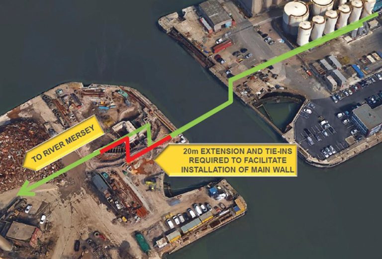 Throughout the works, both the sewer and the Passage were to remain ‘live’, i.e. flow of effluent would continue through the sewer and container ships would continue to access the Seaforth Dock via the Seaforth Passage. Extending the siphon pipe would require excavation to a depth of 20m below reduced ground level (circa 23.5m below original ground level), alongside the original sewer up shaft, within a retaining wall cofferdam.