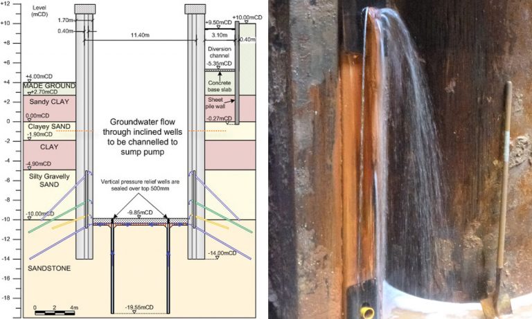 (left) Figure 6: Section detail showing active pumping wells, vertical and inclined pressure relief wells & drainage layer and (right) Figure 7: Groundwater depressurisation in action – Courtesy of OGI Groundwater Specialists Ltd