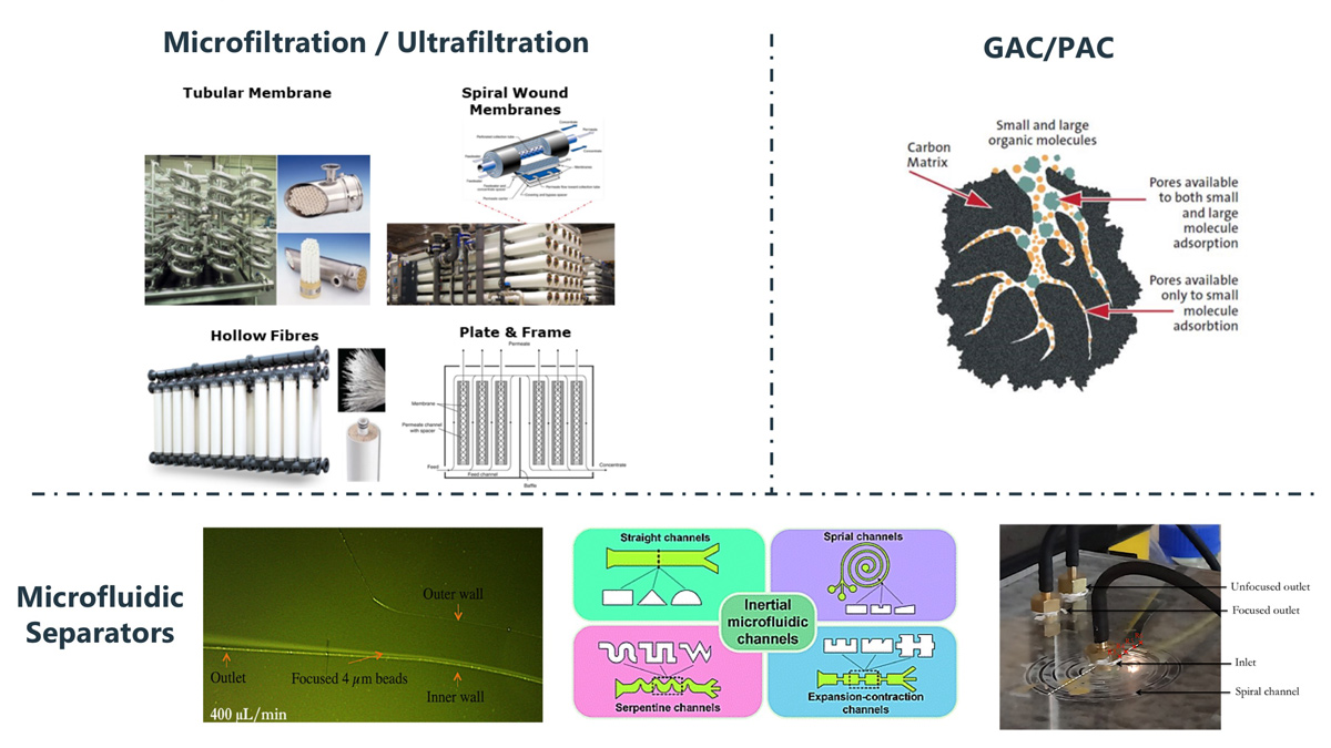 MF/RO membrane separation, GAC/PAC adsorption, and microfluidic separation processes – Schematics from: (PCI Membranes, 2021) (Applied Membranes Inc, 2021) (reverseomosis4operators.com, 2021) (Balster, 2013) (ElgaLab, 2021) (Jimenez & Bridle, 2016) (Tang, 2020) (Miller, 2016)