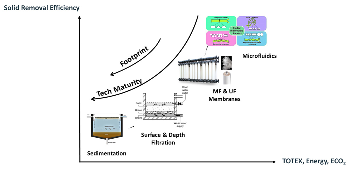 The small footprint, modularity, and scalability of membrane technologies make them a suitable choice for small WTWs, where having a compact design is a priority. Moreover, MF/UF offer effective removal efficiencies (i.e. up to 7 log removal for viruses, up to 6 log removal for Cryptosporidium) for where a high degree of purification is necessary. Still, for larger WTWs and/or where lower ratio of recovered process water recycling is required, MF/UF membranes do not offer an economically feasible option. The high cost of membranes makes MF/UF technologies 10 – 15 times more expensive in terms of CAPEX than other technologies, while the high cost of pumping energy (0.2-0.3 kWh/m3) make the OPEX of MF/UF systems 2-15 times higher than other solid-liquid separation techniques, except microfluidic devices.