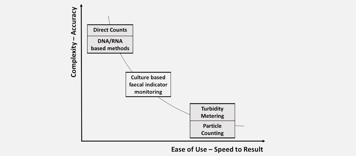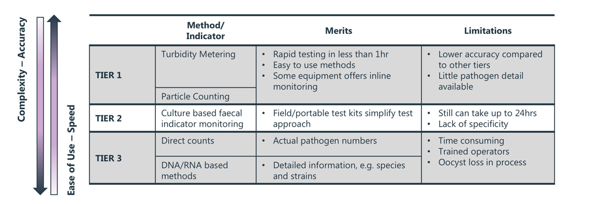 Monitoring method selection: The main methods of detection and monitoring of microplastics, Cryptosporidium and viruses were grouped and reviewed under three main tiers, based on the methods ease of use/time to result, and the accuracy/quality of the results from each method.