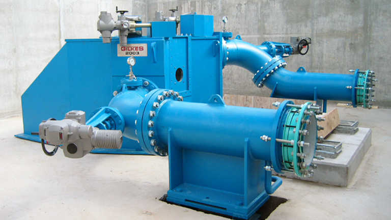 A Gilkes Impulse Turbine could then be installed as the power recovery turbine as the plant now facilitated a free discharge machine. The turbine acts as both pressure and flow regulator for the intake works. In the event there is a loss of grid, the flow regulating needle valves, integral in the machines design, remain fixed until such time as mains power is recovered. Pressure continues to be broken by means of directing the needle jets at deflector plates inside the turbine case and the water falls to the intake chamber from where it continues in the normal way to the process plant.